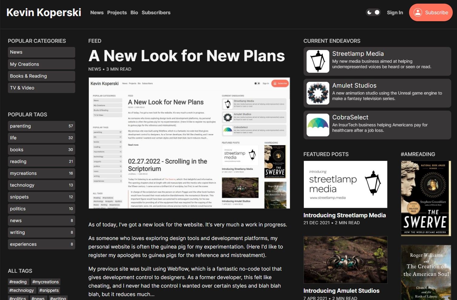 I've rebuilt the site using the Ghost platform. I used a heavily modified version of a Ghost starter template, and, as a result, the code is a mess and I've got excess styling everywhere. Most of you won't notice or care, but it bugs me. If the site doesn't perform well on your device, let me know. I haven't thoroughly tested it. Once I've figured out the nuances of the platform, I'll rebuild from scratch. I could probably do it now, because Ghost is super easy, but one step at a time.